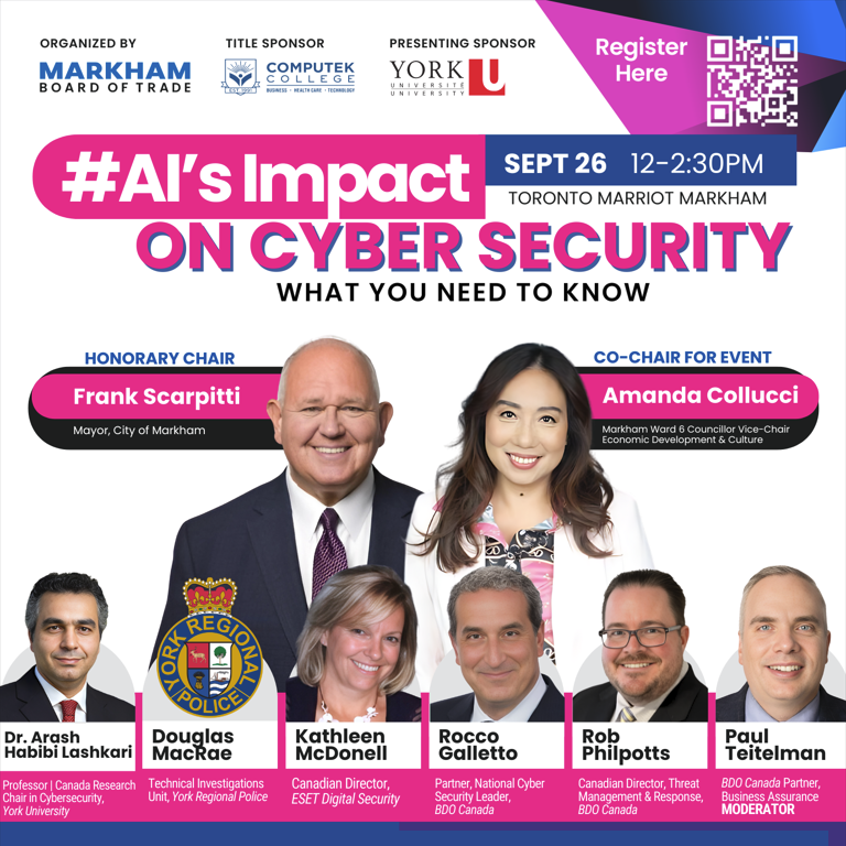 Organized by the Markham Board of Trade, with Markham Mayor Frank Scarpitti as Honorary Chair and City Councillor Amanda Collucci as Co-Chair, this event will bring together leading national experts to explore how artificial intelligence (AI) is rapidly transforming the cybersecurity landscape.