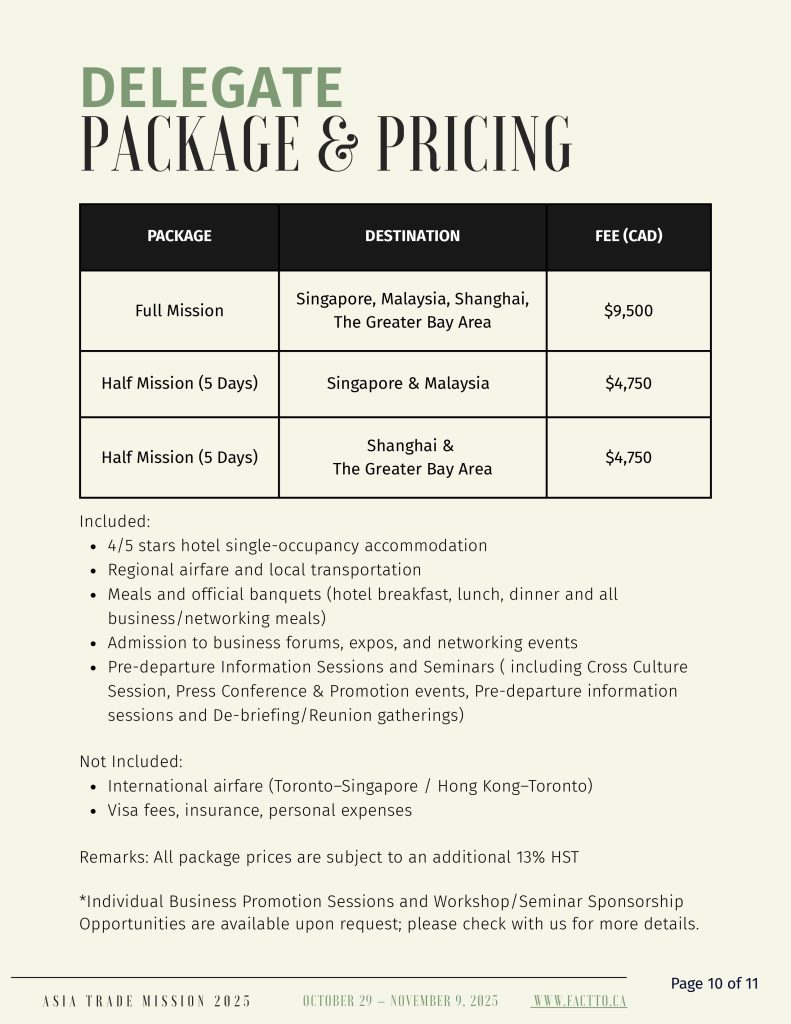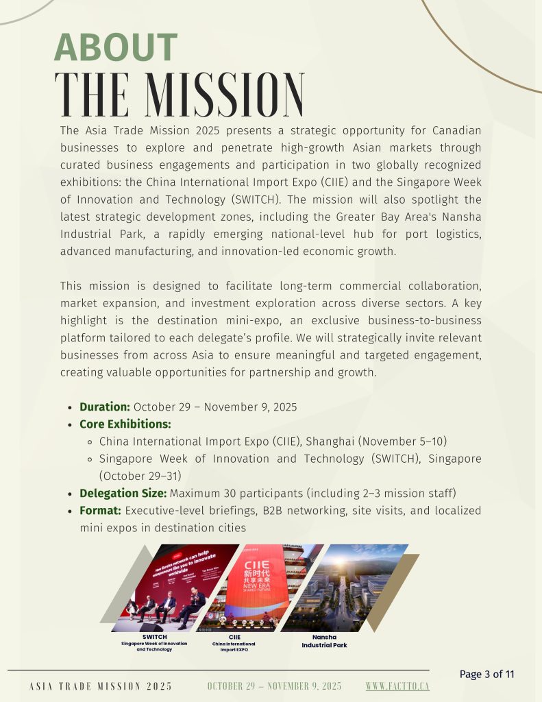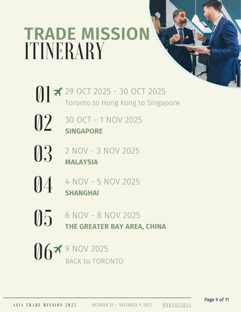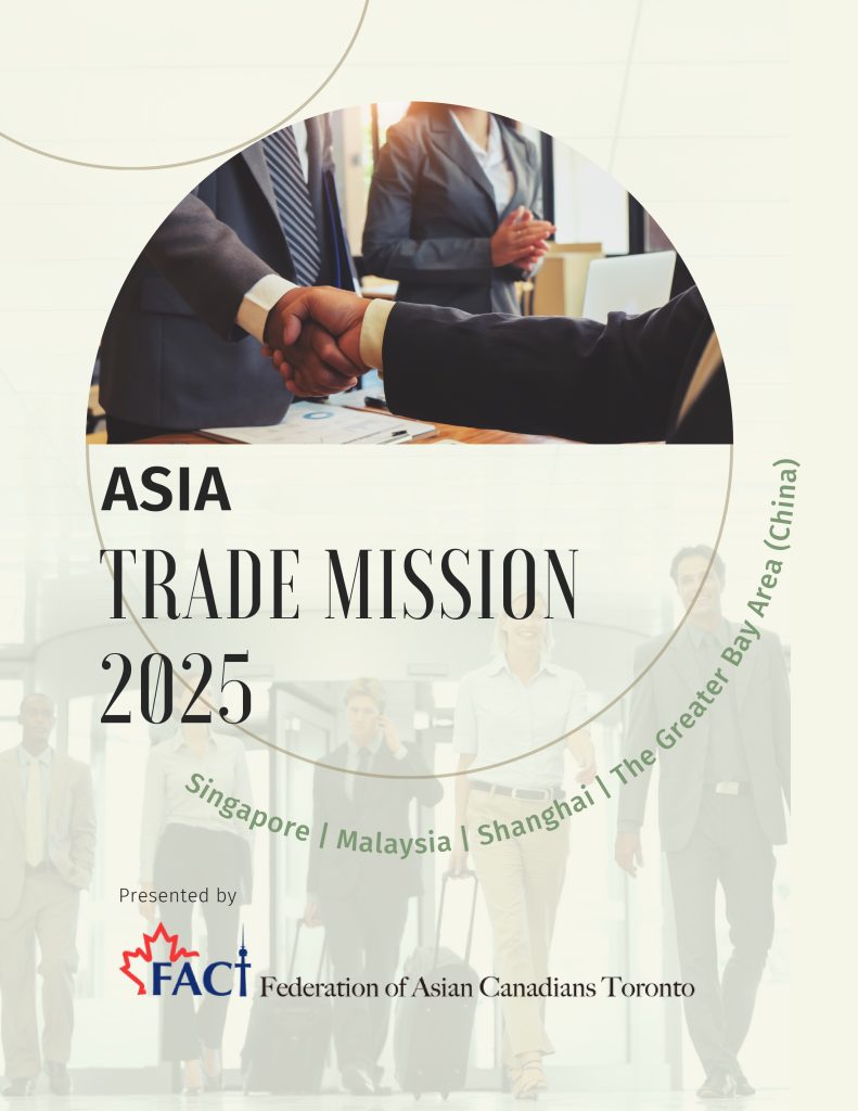 The Asian Business and Trade Expo and Trade Mission serves as a pivotal platform uniting global Asian businesses, technology, and culture. It facilitates connections and fosters exchanges among multicultural ethnic groups. The Trade Mission will begin in Q4 2025. This 12-day Asia Trade Mission, departing from Toronto and will explore high-potential markets in China, Malaysia, and Singapore—economies with thriving post-pandemic growing demand in sectors like clean tech, AI, hospitality, and life sciences. Canadian delegates will engage directly with top companies to build meaningful business to business partnerships and gain strategic market insights, positioning themselves for long-term expansion in Asia’s dynamic business landscape.