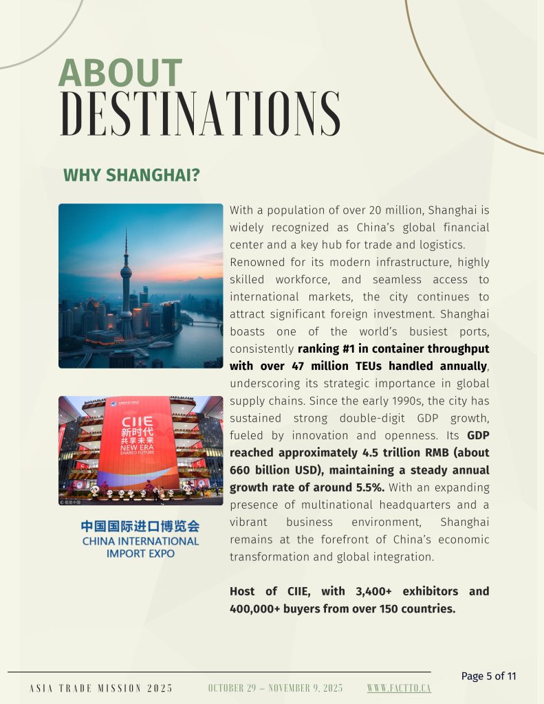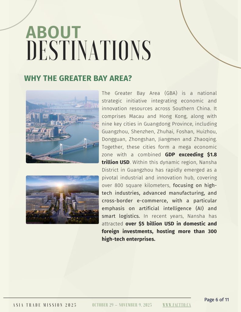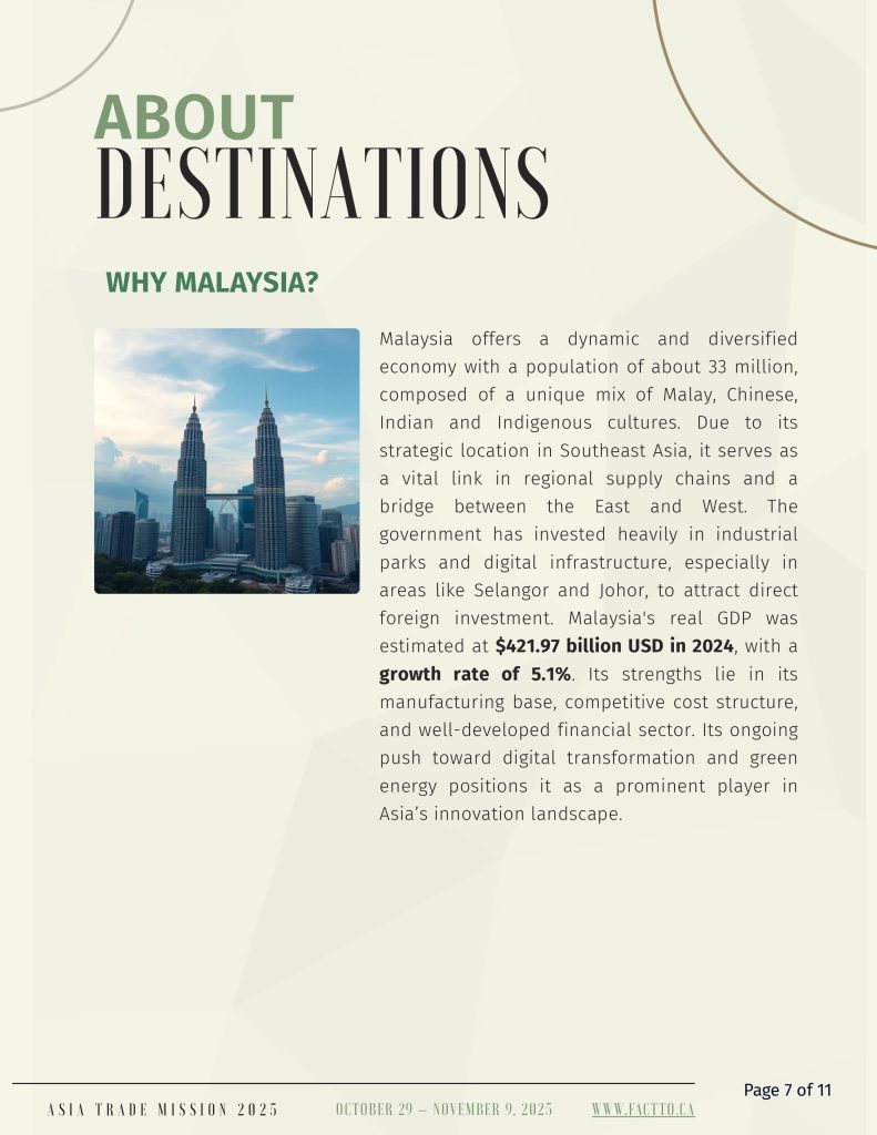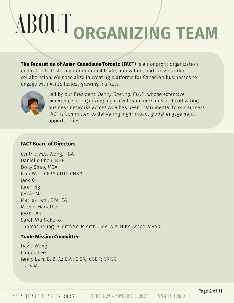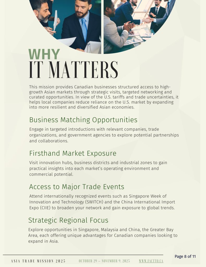 The Asian Business and Trade Expo and Trade Mission serves as a pivotal platform uniting global Asian businesses, technology, and culture. It facilitates connections and fosters exchanges among multicultural ethnic groups. The Trade Mission will begin in Q4 2025. This 12-day Asia Trade Mission, departing from Toronto and will explore high-potential markets in China, Malaysia, and Singapore—economies with thriving post-pandemic growing demand in sectors like clean tech, AI, hospitality, and life sciences. Canadian delegates will engage directly with top companies to build meaningful business to business partnerships and gain strategic market insights, positioning themselves for long-term expansion in Asia’s dynamic business landscape.