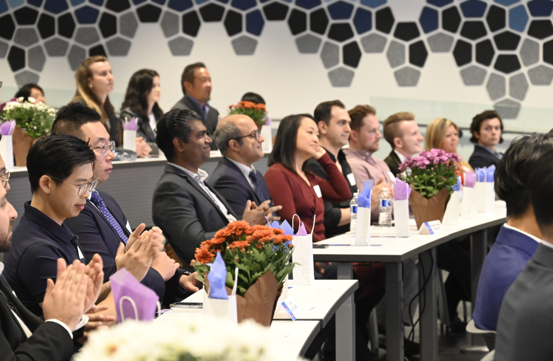 Audience attentively engaged at the Top 40 Under 40 Awards, recognizing their fellow finalists, seated in a lecture hall at York University’s Markham campus with tables adorned with gift bags.